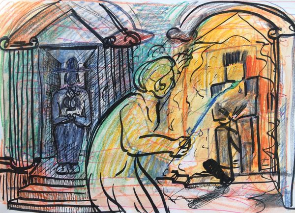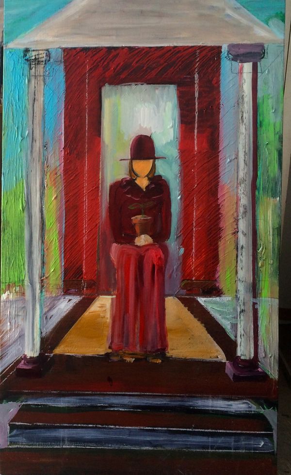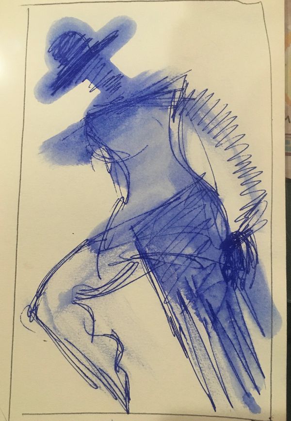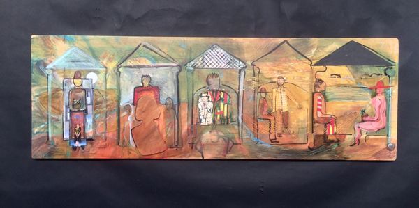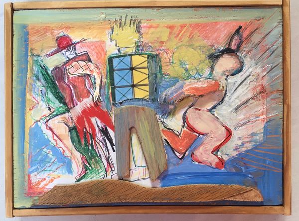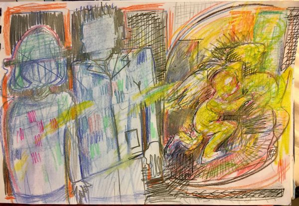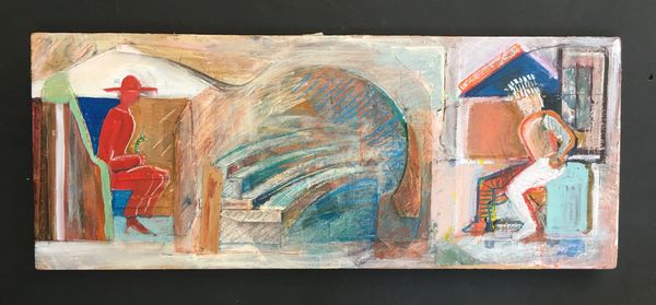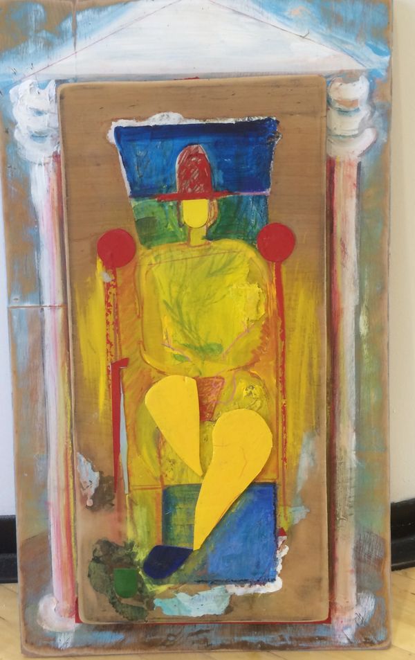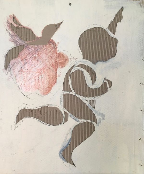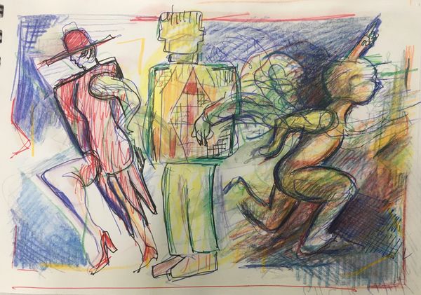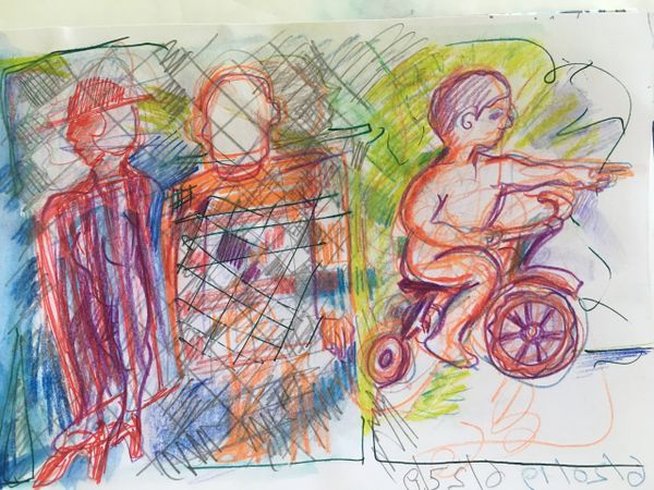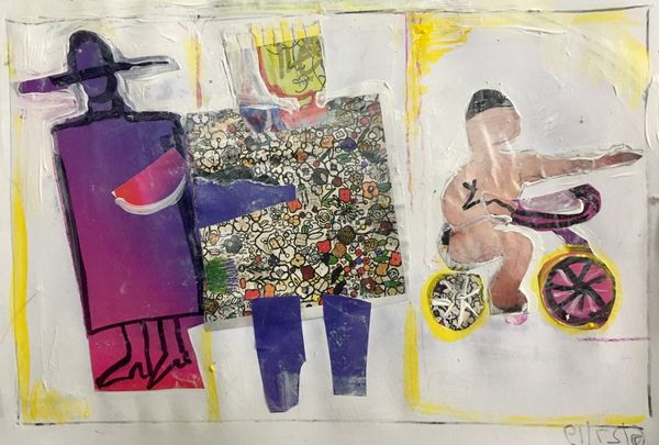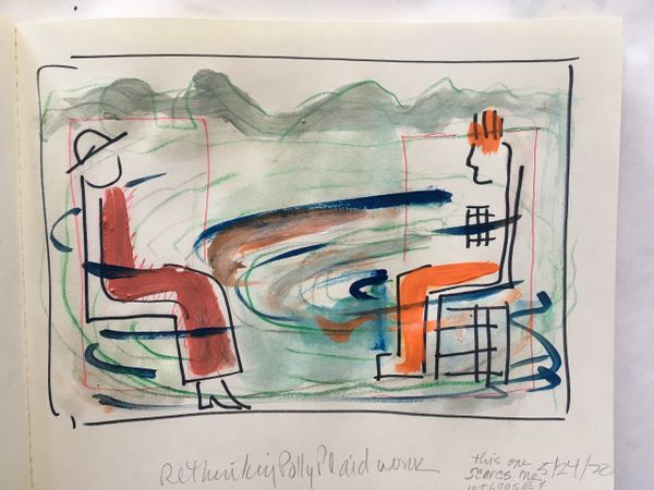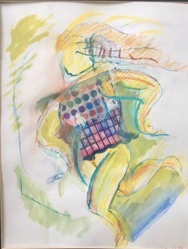 This is my dream series of “Miss Polly”. She followed me into the studio and morphed over time. In one dream she tried to protect me from a new character- the un-stoppable Plaidman (who wore a ridiculous plaid suit). They worked out their roles in drawings and paintings. When Plaidman centered himself and Polly started running away, a third character evolved - a young boy-child running (or bicycling) in the opposite direction— with his left arm raised as if to say “Follow Me” or “There’s Hope!”.